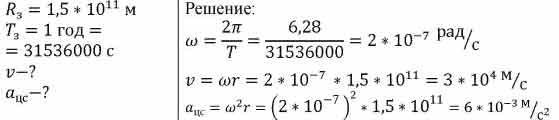 Определите модули скорости и центростремительного ускорения Земли при её движении вокруг Солнца. Радиус орбиты Земли считайте равным R = 1,5 * 10^8 км