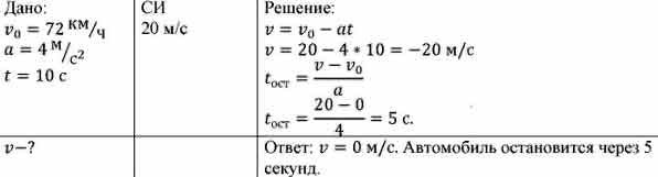 При торможении перед светофором автомобиль двигайся равноускоренно и прямолинейно с ускорением 4 м/с2. С какой скоростью двигался автомобиль через 10 с после момента начала торможения, если скорость автомобиля в момент начала торможения была равна 72 км/ч?