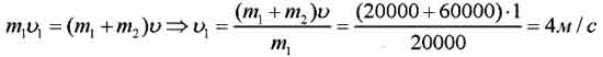 Пустой вагон массой 20 т наезжает на покоящийся груженый вагон массой 60 т и сцепляется с ним. После сцепки вагоны движутся со скоростью 1 м/с. Какова начальная скорость пустого вагона?