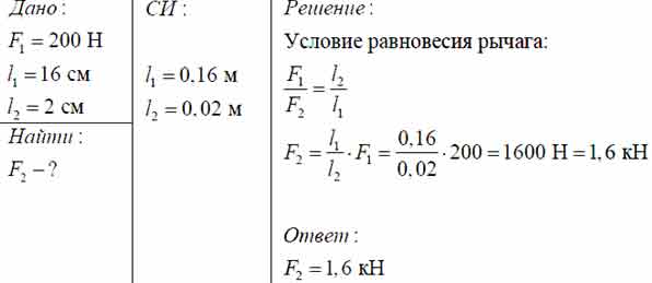 При помощи кусачек перекусывают гвоздь. Рука сжимает кусачки с силой 200 Н. Расстояние от оси вращения кусачек до гвоздя равно 2 см, а до точки приложения силы руки — 16 см. Определите силу, действующую на гвоздь.