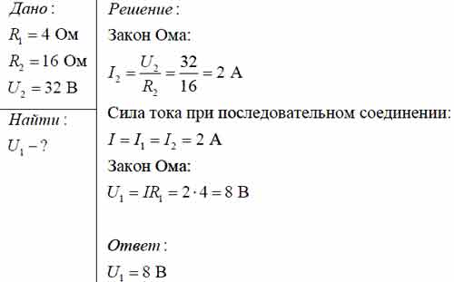 Чему равно напряжение, которое покажет вольтметр, подсоединённый к точкам А и В (рис. 90), если известно, что R1 = 4 Ом, R2 = 16 Ом, а напряжение между точками В и С составляет 32 В?