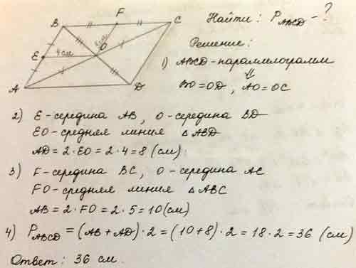 О - точка пересечения диагоналей параллелограмма ABCD, E и F - середины сторон АВ и ВС, ОЕ = 4 см, OF = 5 см. Найдите периметр ABCD