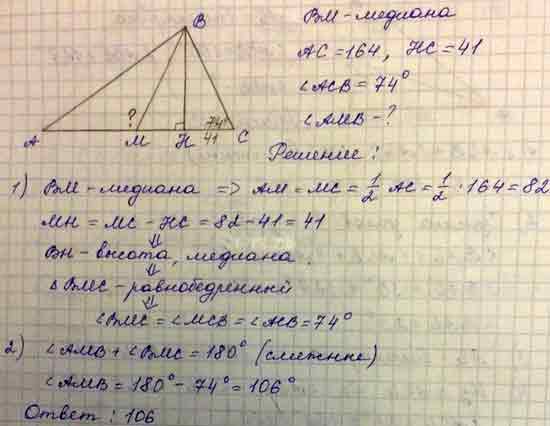 В треугольнике ABC  BM — медиана и BH — высота. Известно, что AC=164, HC=41 и <ACB=74º. Найдите угол AMB. Ответ дайте в градусах