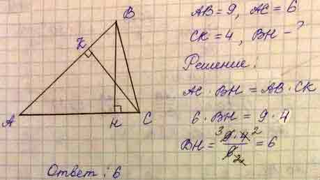 В треугольнике со сторонами 9 и 6 проведены высоты к этим сторонам. Высота, проведённая к первой их этих сторон, равна 4. Чему равна высота, проведённая ко второй стороне?
