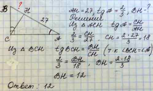 В треугольнике ABC угол С равен 90°, CH - высота, AH = 27, tg A = 2/3. Найдите BH