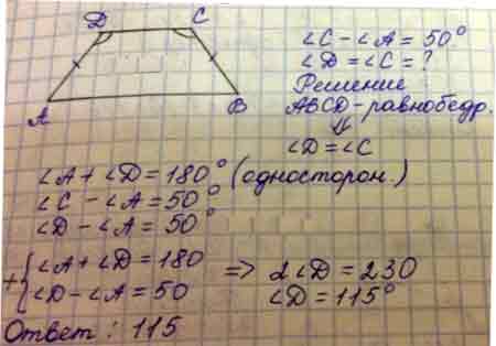 Чему равен больший угол равнобедренной трапеции, если известно, что разность противолежащих углов равна 50