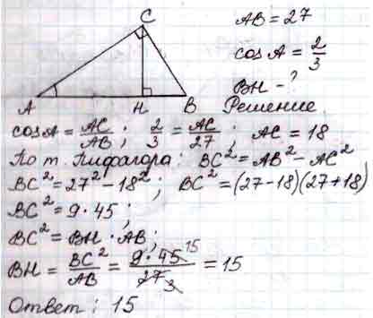 В треугольнике ABC угол C равен 90°, CH - высота, AB = 27, cos A = 2/3. Найдите BH