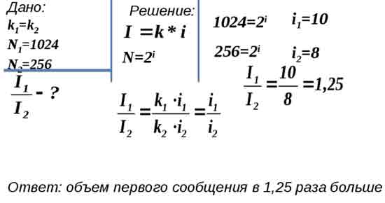 Два сообщения состоят из одинакового количества символов. Первое записано с помощью 1024-символьного алфавита, а второе – с помощью 256-символьного алфавита. Сравните, во сколько раз отличаются объемы данных сообщений