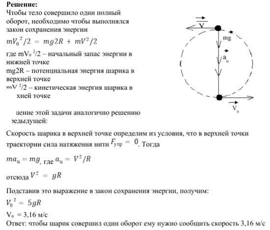 Маленький шарик массой 20 г висит на невесомой нерастяжимой нити, закрепленной на горизонтальной тонкой оси. Длина нити 20 см. Какую минимальную скорость нужно сообщить шарику, чтобы он совершил полный оборот вокруг оси в вертикальной плоскости? (Сопротивлением воздуха пренебречь.)