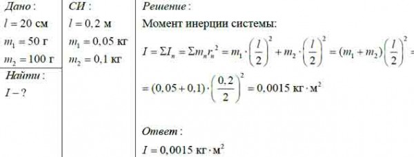 На концах невесомого стержня длиной 20 см закреплены два маленьких шарика массами 50 г и 100 г. Определите момент инерции системы относительно оси, проходящей через середину стержня перпендикулярно ему.
