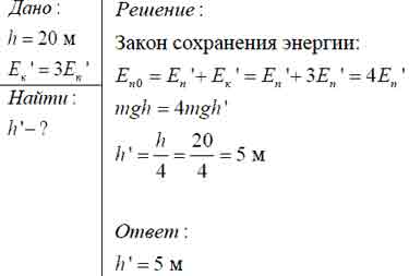 Тело свободно падает с высоты 20 м. На какой высоте кинетическая энергия тела будет в три раза больше потенциальной?