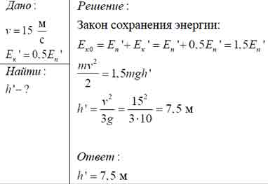 Малое тело бросают вертикально вверх со скоростью 15 м/с. На какой высоте кинетическая энергия составит половину потенциальной энергии тела?