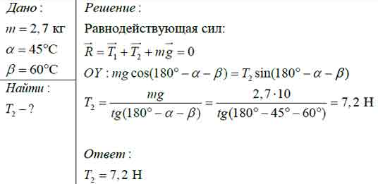 Груз массой m = 2,7 кг подвешен на двух нитях так, как показано на рисунке. Угол а = 45°, угол в = 60°. Определите силу Т2 натяжения нити.