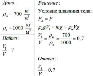 Тело, плотность вещества которого 700 кг/м3, опущено в воду (р = 1000 кг/м3). Какая часть тела окажется в воде?