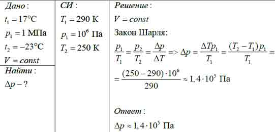 В баллоне постоянного объёма находится идеальный газ при температуре 17 °С и давлении 1 МПа. Температуру газа понизили до -23 °С. Определите изменение давления газа.