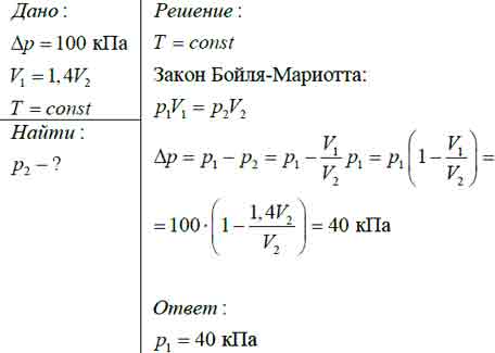 При изотермическом процессе после сжатия газа его объём уменьшился в 1,4 раза, а давление изменилось на 100 кПа. Определите конечное давление.