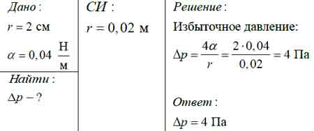 Определите дополнительное давление в мыльном пузыре радиусом 2 см. (Коэффициент поверхностного натяжения мыльного раствора 0,04 Н/м.)