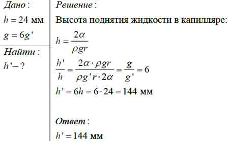 На поверхности Земли вода по капиллярной трубке поднимается на 24 мм. На какую высоту поднимется вода на Луне по той же трубке? Считайте, что ускорение свободного падения на Луне в 6 раз меньше, чем на Земле.