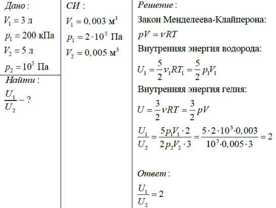 Один баллон объёмом 3 л заполнен водородом под давлением 200 кПа, другой баллон объёмом 5 л заполнен гелием под давлением 10^5 Па. Определите, во сколько раз отличаются внутренние энергии этих газов.