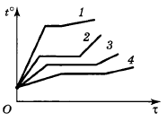 На рисунке представлены зависимости температуры t от времени х нагревания нескольких тел. В начальный момент все тела находятся в жидком состоянии. Какое из веществ обладает наименьшей температурой кипения?