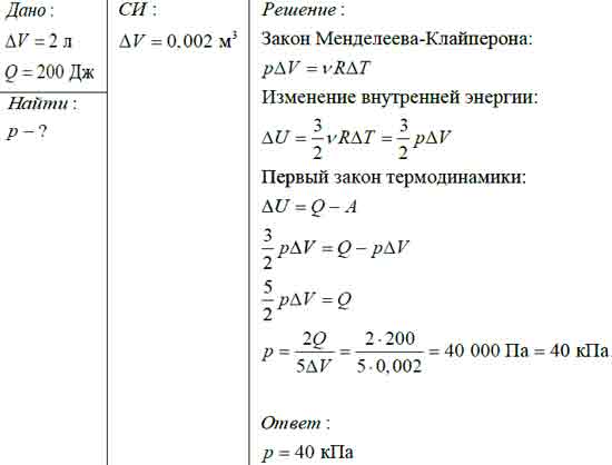 Идеальному одноатомному газу при изобарном процессе было передано количество теплоты, равное 200 Дж. Определите давление газа, если изменение объёма в ходе процесса составило 2 л.