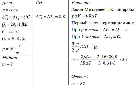 Для изобарного нагревания кислорода некоторой массы на 8 °С потребовалось количество теплоты, равное 29,11 Дж. Для изо-хорного нагревания кислорода на те же 8 °С потребовалось количество теплоты, равное 20,8 Дж. Определите массу газа.