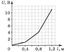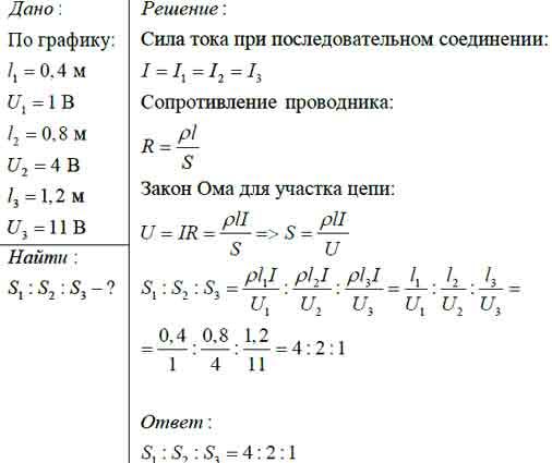 На графике представлена зависимость падения напряжения от длины для трёх последовательно соединённых проводников. Проводники изготовлены из одного и того же материала. Определите соотношение площадей поперечного сечения этих проводников.