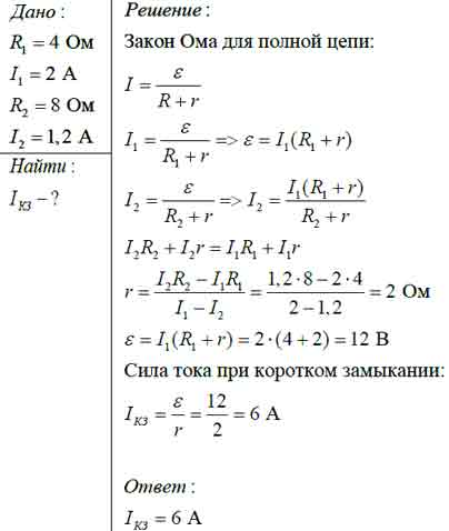 К источнику тока подключили резистор сопротивлением 4 Ом, при этом сила тока в цепи составила 2 А. Когда к тому же источнику подключили резистор сопротивлением 8 Ом, сила тока в цепи стала равна 1,2 А. Определите ток короткого замыкания.