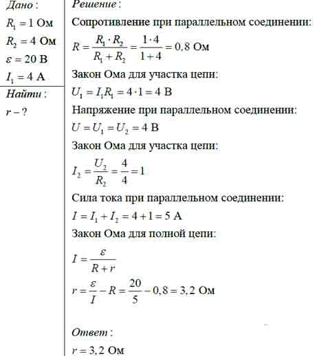 Два резистора сопротивлениями 1 Ом и 4 Ом соединили параллельно и подключили к источнику тока с ЭДС 20 В. Определите внутреннее сопротивление источника, если сила тока в первом резисторе равна 4 А.