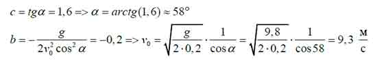 Используя значения b = -0,2 м-1 и с = 1,6, вычислите начальную скорость v и угол а, под которым брошено тело.