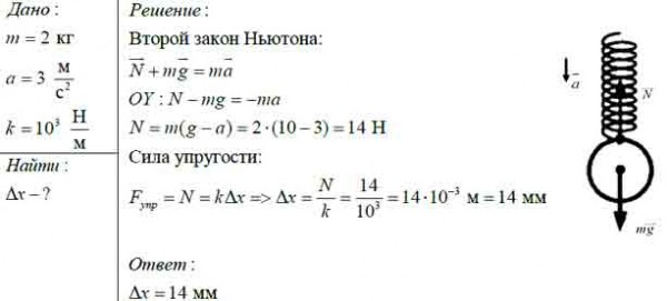 К динамометру привязан груз массой 2 кг. Динамометр с грузом опускают с ускорением 3 м/с2. Жёсткость пружины 10^3 Н/м. Определите модуль растяжения пружины динамометра.