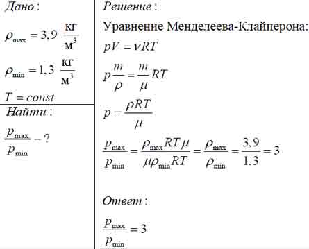 Плотность идеального газа меняется с течением времени так, как показано на рисунке. Температура газа при этом постоянна. Во сколько раз давление газа при максимальной плотности больше, чем при минимальной?