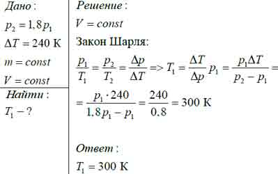 Идеальный газ изохорно нагревают так, что его температура изменяется на T = 240 К, а давление — в 1,8 раза. Масса газа постоянна. Определите начальную температуру газа по шкале Кельвина.
