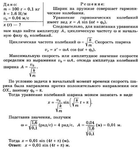 Шарику массой 100 г, висящему на пружине жесткостью 1,6 Н/м, сообщили скорость 0,04 м/с, направленную вертикально вниз, и одновременно включили секундомер. Запишите закон изменения координаты шарика х от времени. Ось ОХ направлена вертикально вверх.