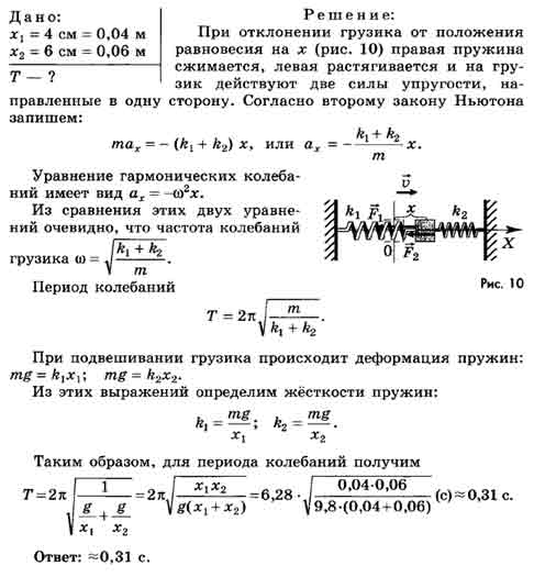 Грузик, надетый на гладкую горизонтальную спицу, соединен двумя невесомыми пружинами (рис. 154). Свободные концы пружин прикреплены к неподвижным стенкам. В положении равновесия пружины не деформированы. Определите период колебаний грузика, если известно, что при его поочередном подвешивании к каждой из пружин по отдельности они удлиняются соответственно на 4 и 6 см