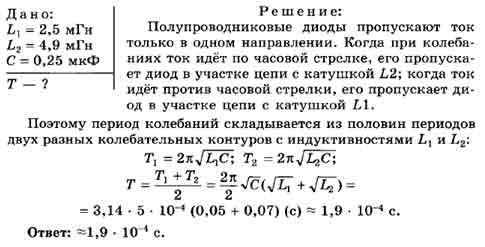 Определите период колебаний в контуре (рис. 157). В цепь включены два идеальных полупроводниковых диода. С = 0,25 мкФ, L1 = 2,5 мГн, L2 = 4,9 мГн.