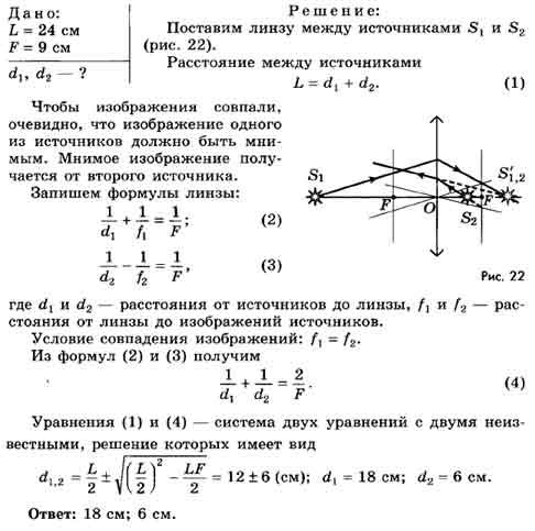 Расстояние между двумя источниками света 24 см. На каком расстоянии от источников следует поставить собирающую линзу с фокусным расстоянием 9 см, чтобы изображения обоих источников оказались в одной точке?