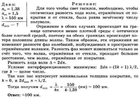 Чему равна минимальная толщина оптического покрытия из MgF2 (п = 1,38), предназначенного для гашения света в окрестности длин волн 550 нм при нормальном падении белого света на стекло с показателем преломления 1,5?