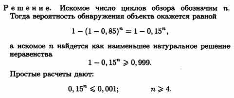 Решение. Искомое число циклов обзора обозначим к. Вероятность обнаружения объекта окажется равной 1 —(1 — 0,85)  =1 — 0,15  . Искомое число циклов обзора найдем как наименьшее натуральное решение неравенства 1-0,15* > 0,999 или 0,15* < 0,001. Отсюда lg0.001/lg0.15= 3,64. Минимальное число циклов равняется четырем