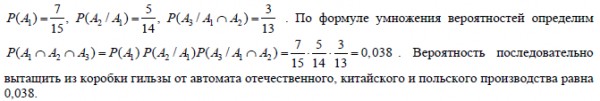 Решение. Определим следующие события: А1 = {первая вынутая гильза от автомата отечественного производства}, А2= {вторая вынутая гильза от автомата китайского производства}, А3= {третья вынутая   гильза   от   автомата   польского   производства}.   Исходя   из   условия   задачи,   имеем