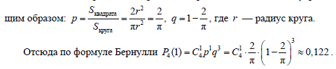 Решение. Вероятность р точки попасть внутрь квадрата считаем вероятностью успеха в серии из 4 независимых бросаний. Вероятность р попадания точки внутрь квадрата вычисляется следующим образом