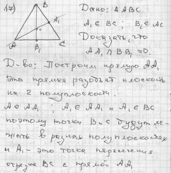 Дан треугольник ABC. На стороне АС взята точка В , а на стороне ВС — точка А,. Докажите, что отрезки АА1 и ВВ, пересекаются.
