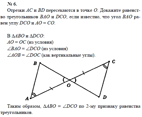 Отрезки А С и BD пересекаются в точке О. Докажите равенство треугольников ВАО и DCO, если известно, что угол ВАО равен углу DCO пАО = СО.