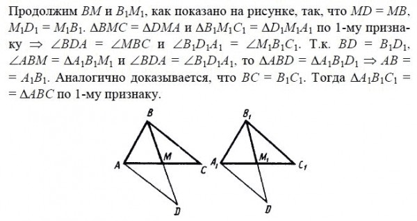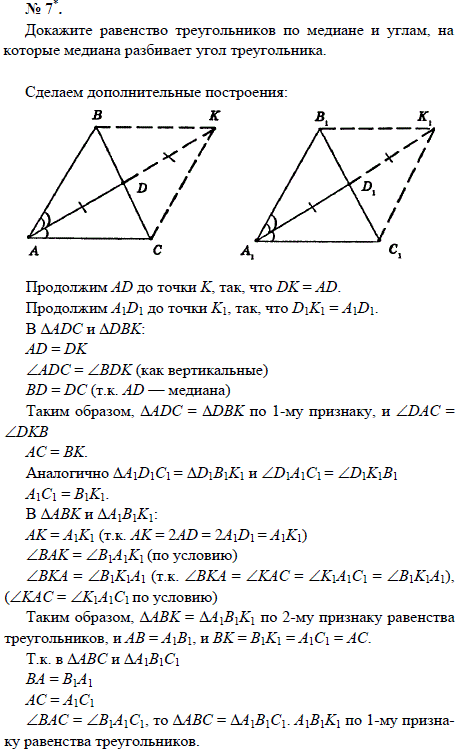 Докажите равенство треугольников по медиане и углам, на которые медиана разбивает угол треугольника.