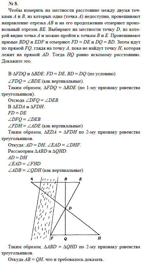 Чтобы измерить на местности расстояние между двумя точками А и В, из которых одна (точка А) недоступна, провешивают направление отрезка АВ и на его продолжении отмеряют произвольный отрезок ВЕ. Выбирают на местности точку D, из которой видна точка А и можно пройти к точкам В и Е. Провешивают прямые BDQ и EDF и отмеряют FD=DE и DQ=BD. Затем идут по прямой FQ, глядя на точку А, пока не найдут точку Н, которая лежит на прямой AD. Тогда HQ равно искомому расстоянию. Докажите это