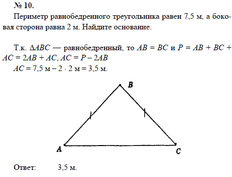 Т.к. ААВС — равнобедренный, то АВ = ВС и Р = АВ + ВС + АС = 2АВ+АС,АС=Р-2АВ ЛС = 7,5м-2-2м = 3,5м.