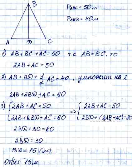 В равнобедренном треугольнике ABC с основанием АС проведена медиана BD. Найдите ее длину, если периметр треугольника ABC равен 50 м, а треугольника ЛШ) — 40 м.