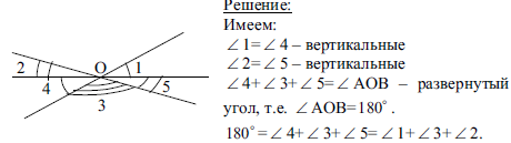 Решение. Пусть Z4 и Z1 — вертикальные углы (см. рис.23). Тогда по свойству вертикальных углов Z4 = Z1, поэтому Zl + Z2 + + Z3 = Z2 + Z4 + Z3. Сумма этих углов равна развернутому углу АО В, поэтому Z2 + Z4 + Z3 = 180°, а значит, Zl + Z2 + Z3 = 180°.
