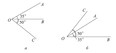 б)  Лучи О А и ОС лежат по одну сторону от прямой ОВ (рис. 33, б). Так как ZAOB < ZBOC, то ZAOC = ZBOC - ZAOB = 50° - 35° = = 15°.