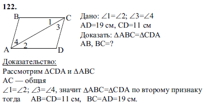 На рисунке 53 (с. 31) ∠1 = ∠2, ∠3 = ∠4. а) Докажите, что ΔАВС=ΔCDА; б) найдите АВ и ВС, если AD= 19 см, CD=11 см